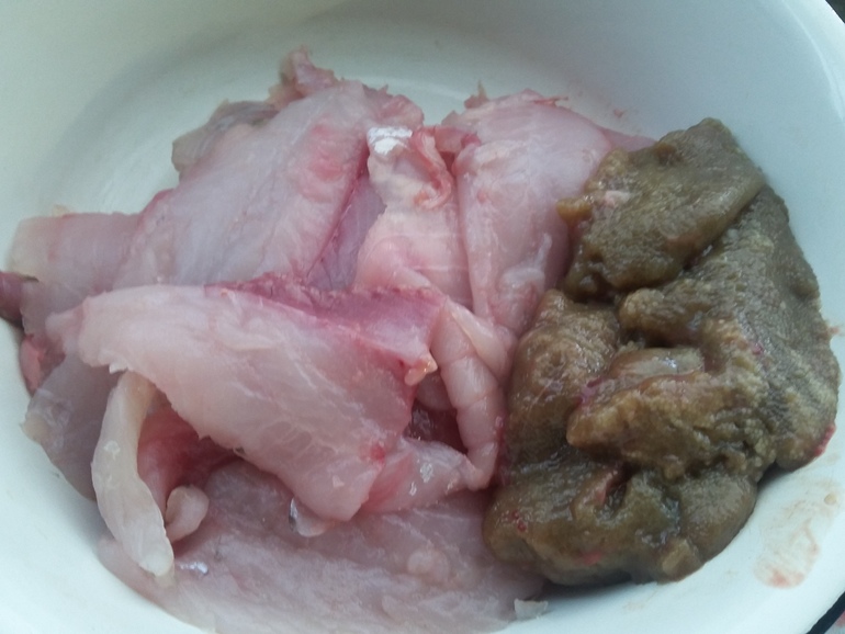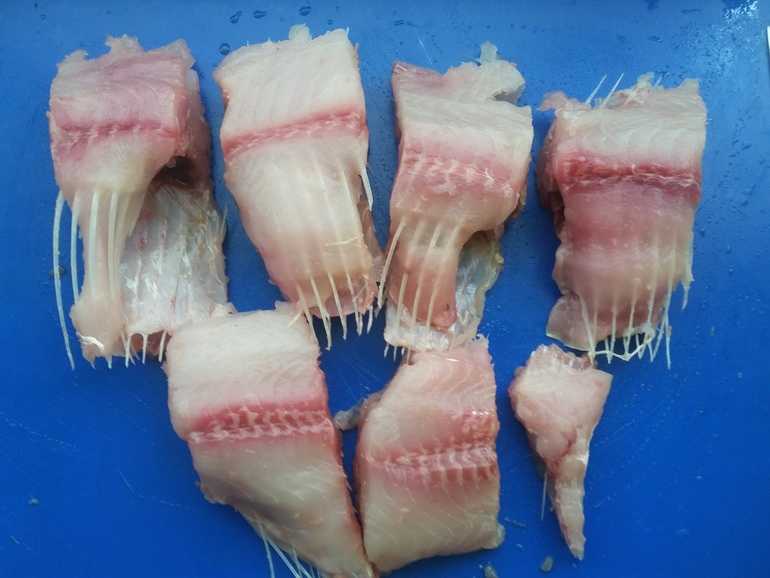 Нарезать толстую часть леща на куски по 4-5 см. Ввести под кожу острый нож и срезать по кругу шкуру (не прорезать!):