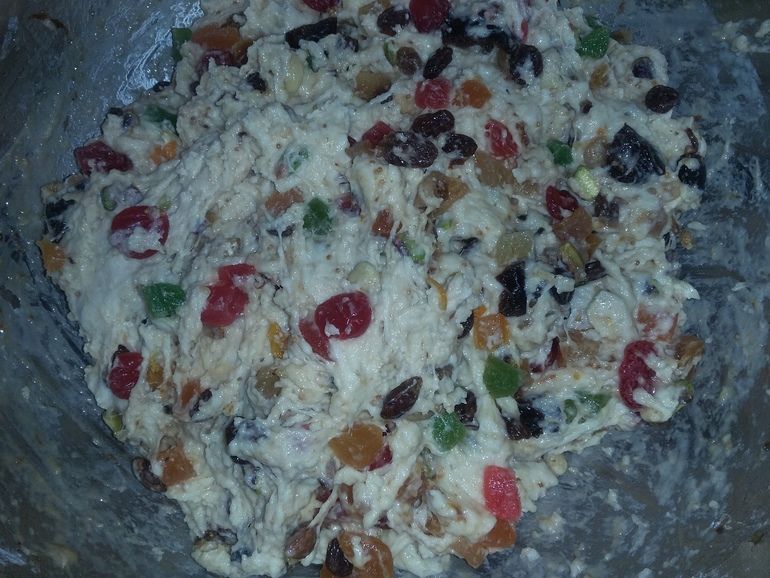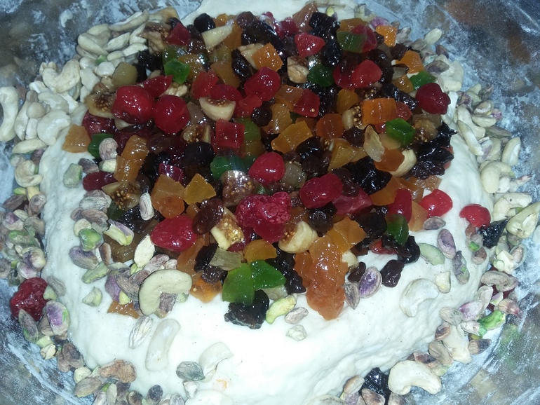 Добавить в тесто сухофрукты (у меня они впитали ВСЮ жидкость) и орехи: