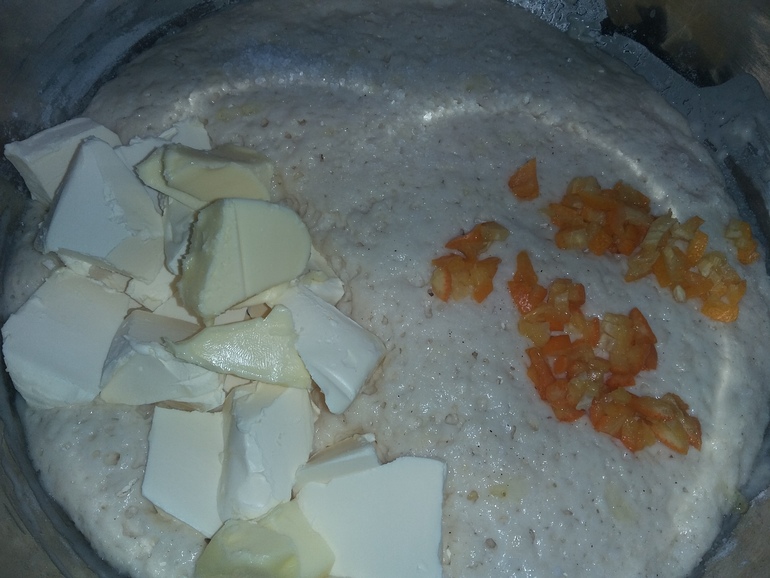 Добавить в опару 0,5 ч.л. соли, ванилин, 200 г сл.масла, цедру лимона (а я кумкварт нарезала):