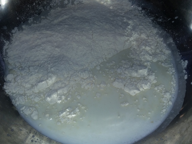 Для опары смешать 0,5 ст. теплого молока, 50 г дрожжей, 0,5 ст. сахара, 2 ст. муки: