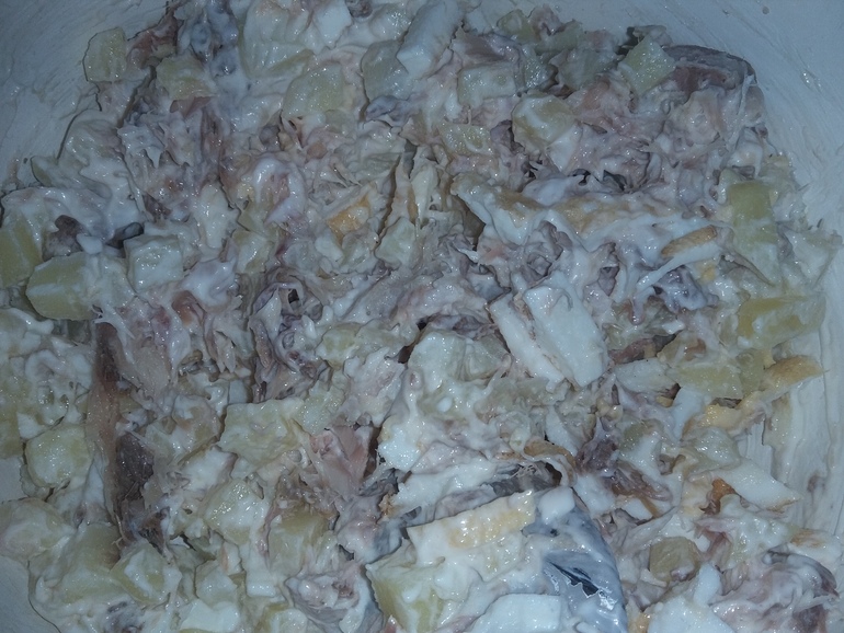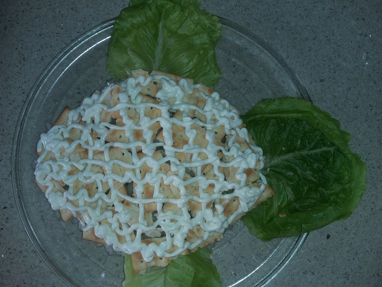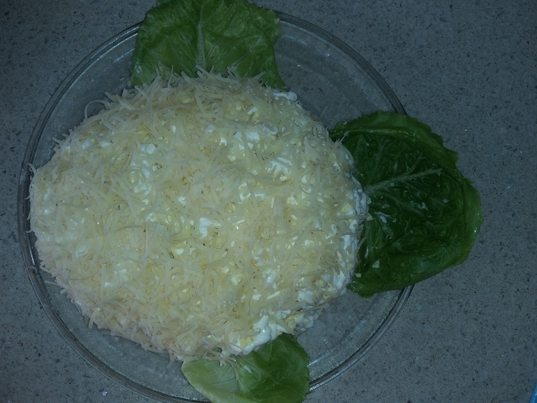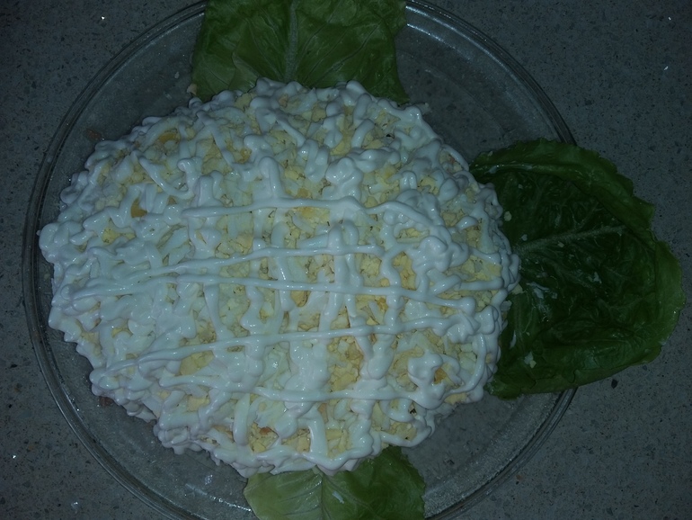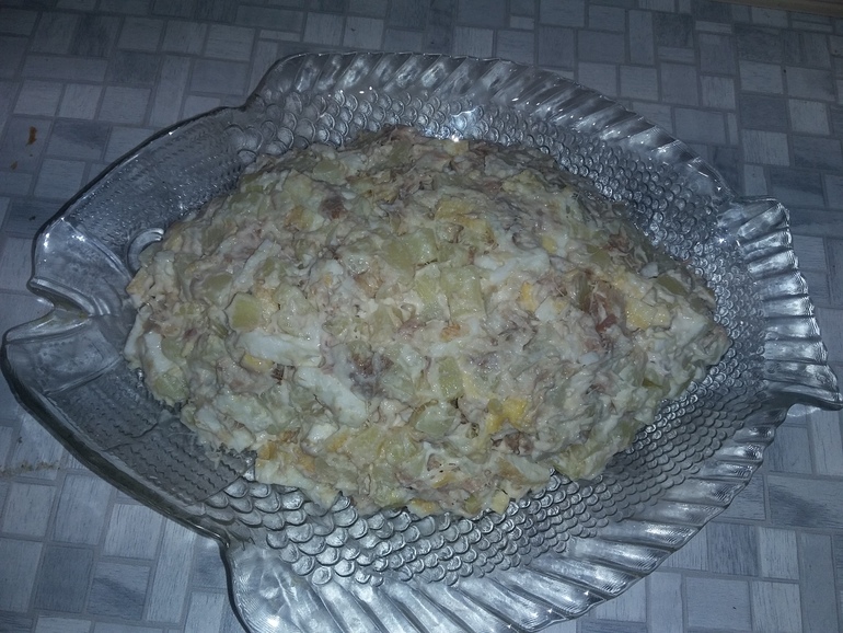 При желании в салат можно добавить маринованный огурчик. Или сделать из кружков огурца чешую. Но в этот раз захотелось так!