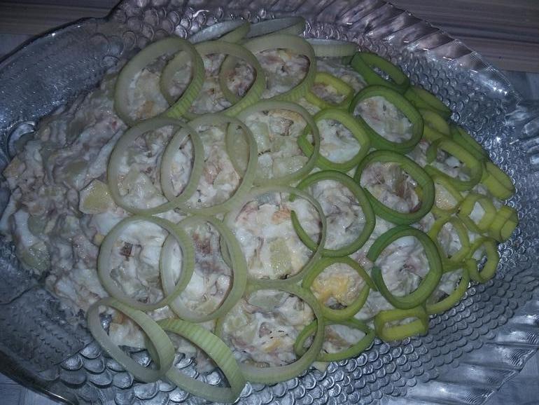 Лук порей нарезать кольцами, разобрать. Уложить "чешую":