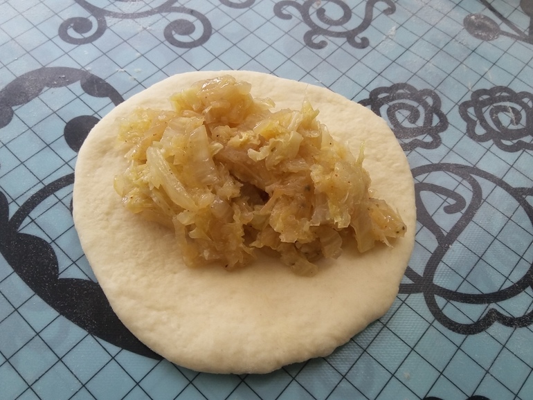 Для капустных пирожков отделяем комочки теста размером с яйцо, раскатываем и кладем по 2 ст.л. начинки: