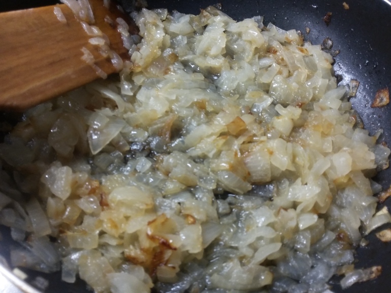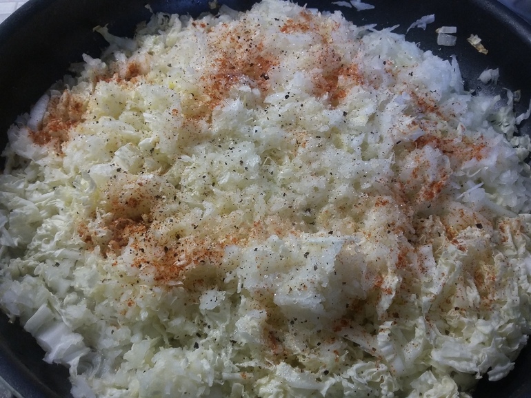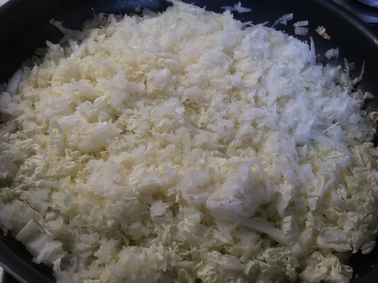 Спассеровать мелконарезанный лук на растительном масле. Натереть на крупной терке или мелко нарезать пекинскую капусту, добавить к луку: