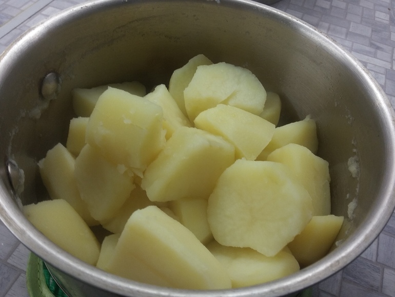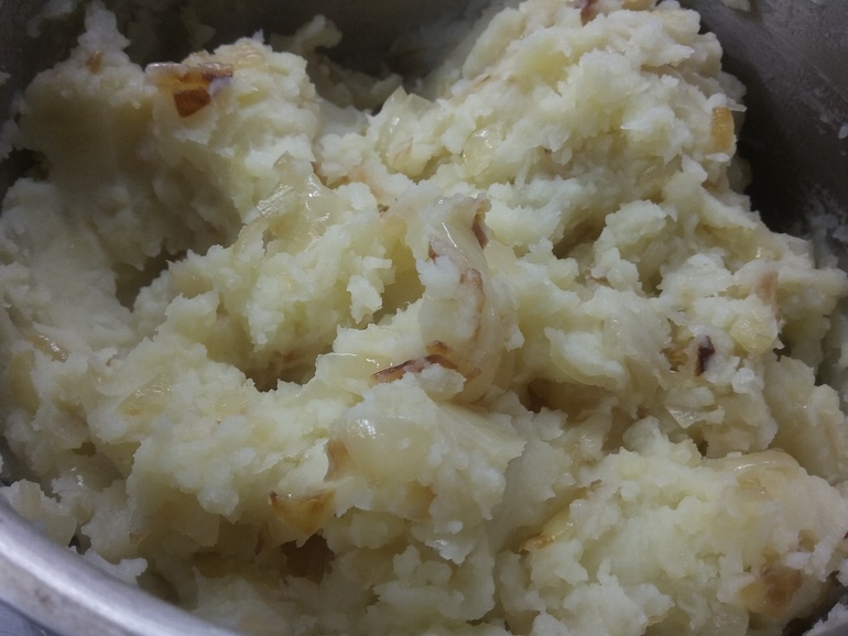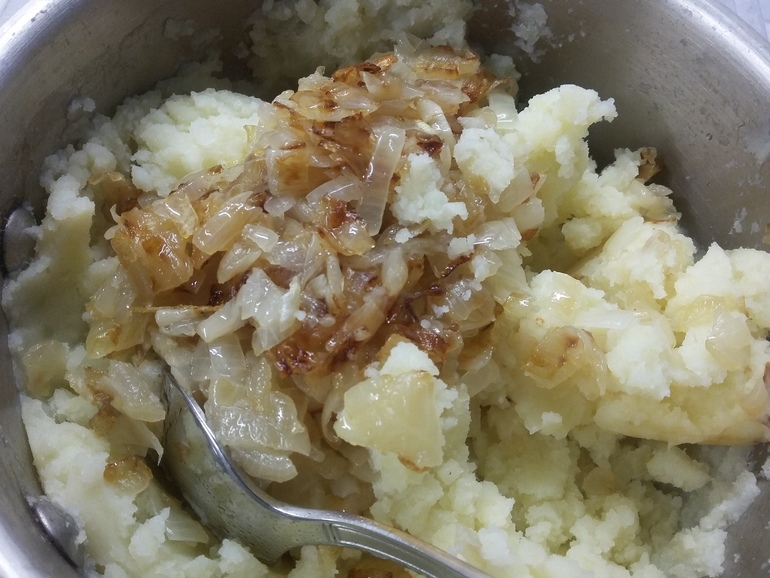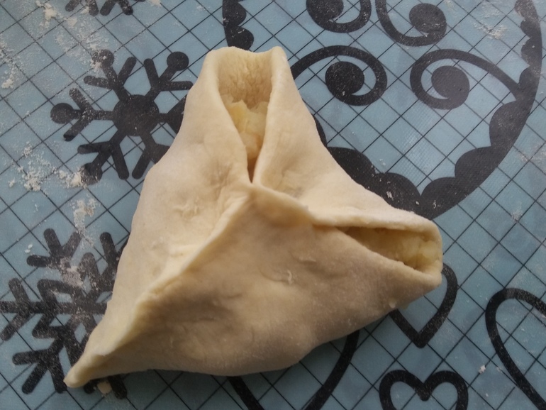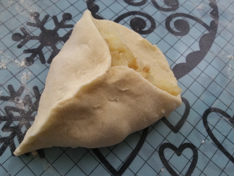 Для пирожков с картошкой тоже делаем комочки и раскатываем. Кладем картофельную начинку и защипываем до половины: