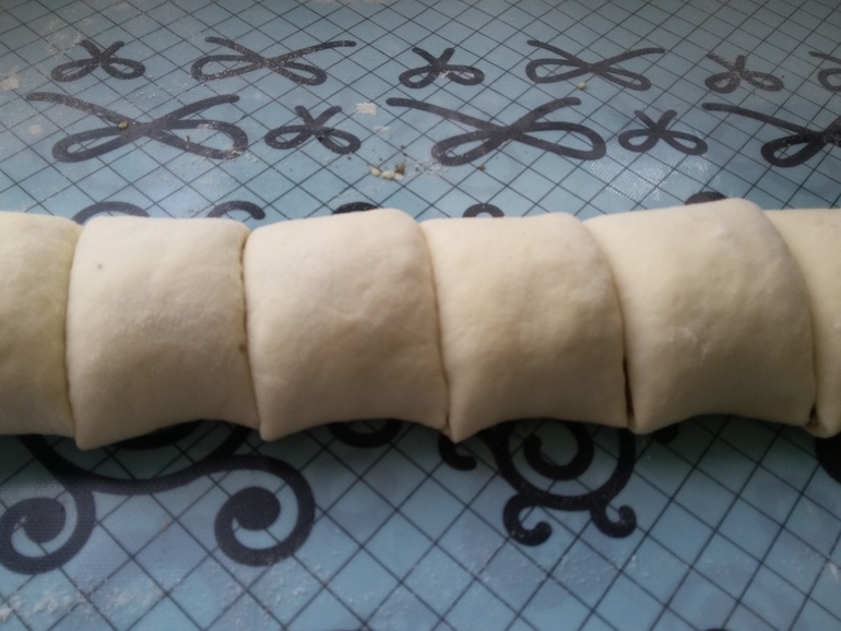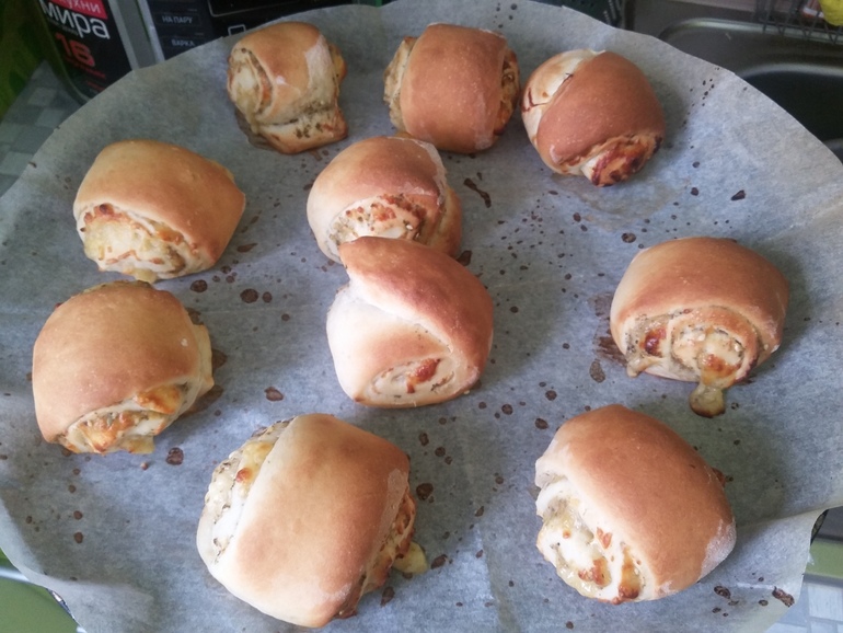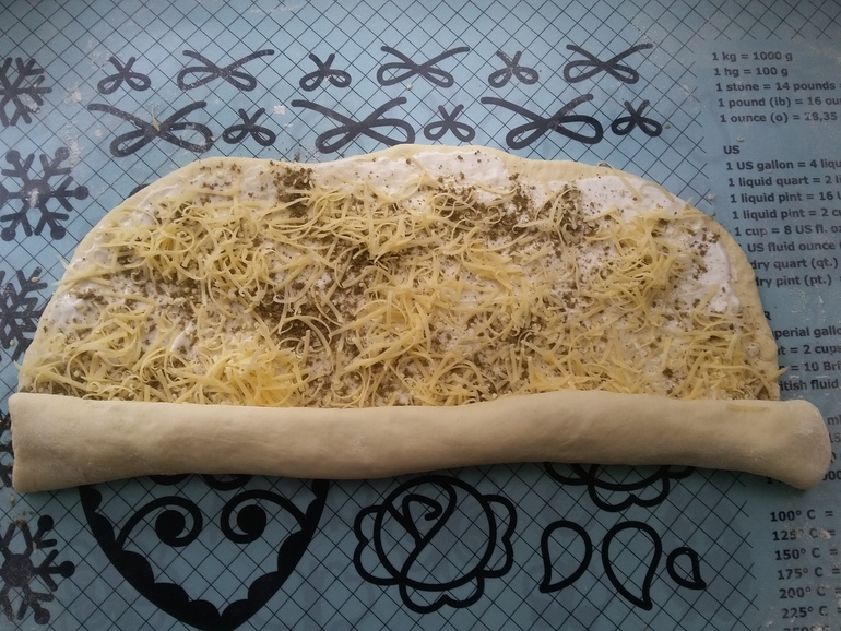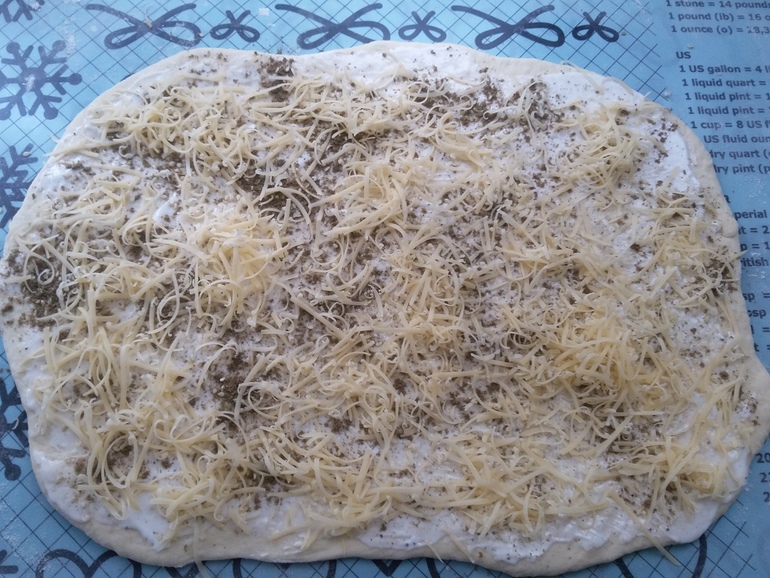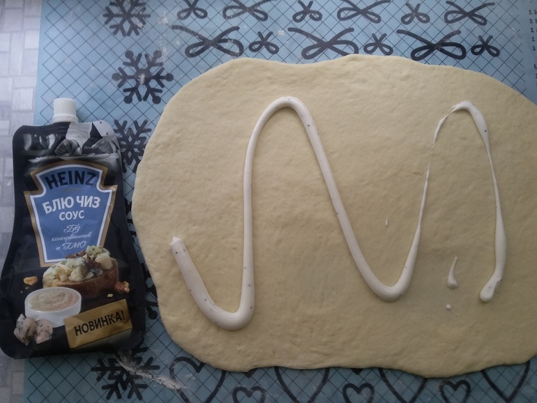 Для рулетиков с затаром раскатываем оставшееся тесто в пласт толщиной 5 мм, смазываем чесночным или сырным соусом: