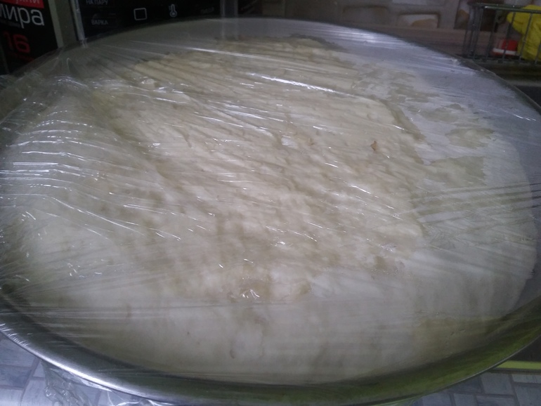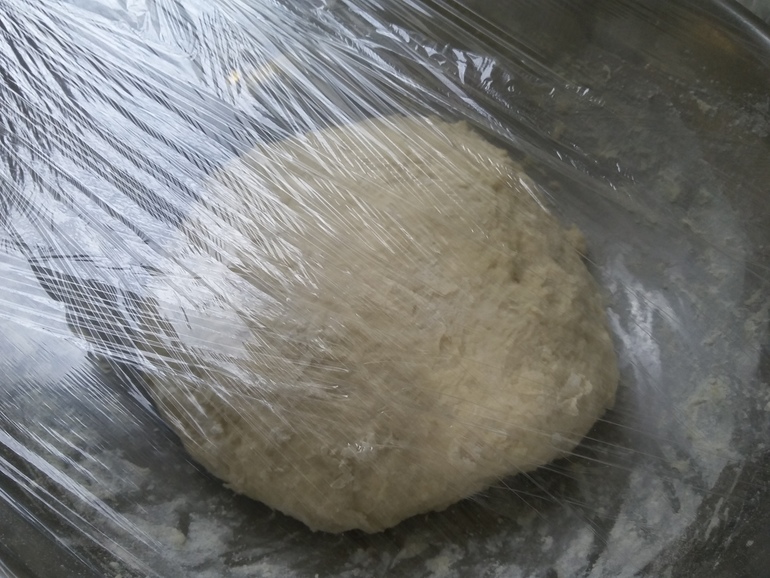 Перемешать, затянуть пленкой, дать опаре подойти в теплом месте: