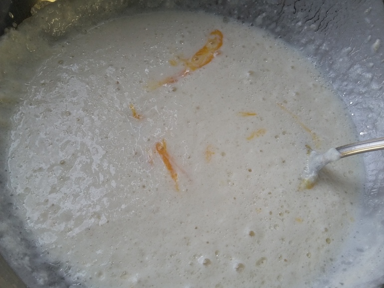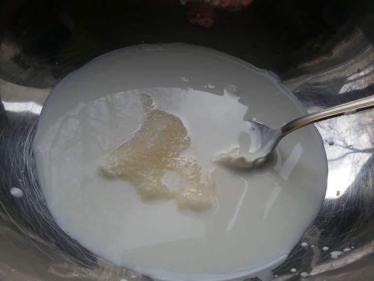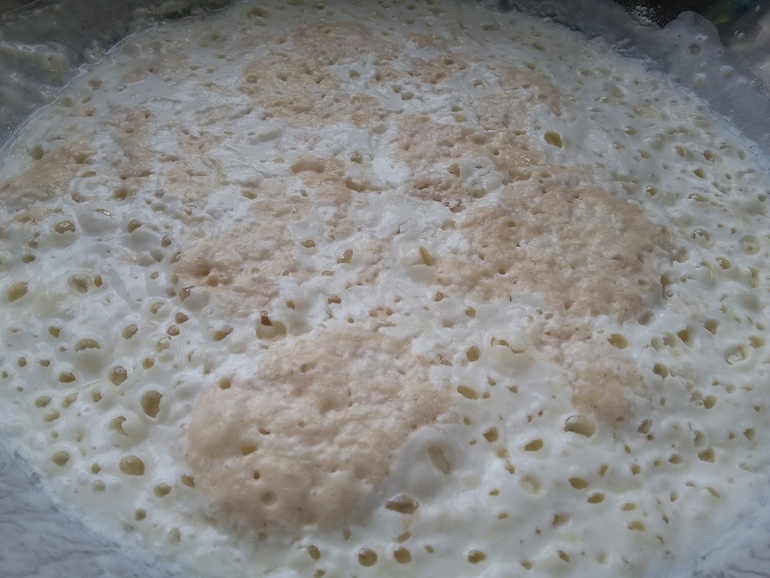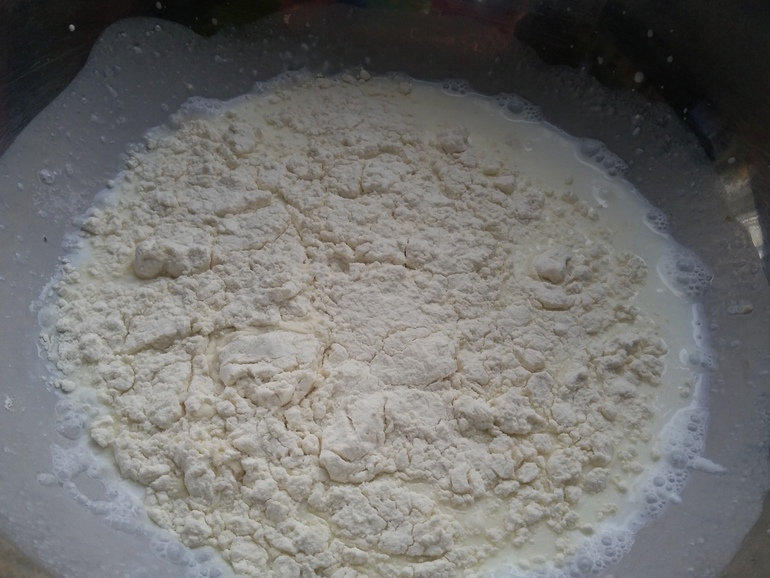 400 мл молока, 3 ст.л. сметаны, 3 ст.л. сахара и 1 ст.л. с горкой живых дрожжей: