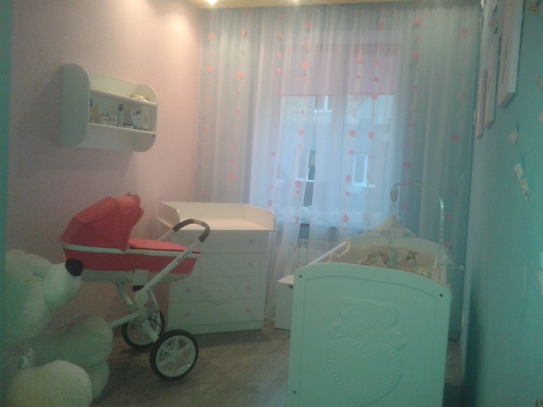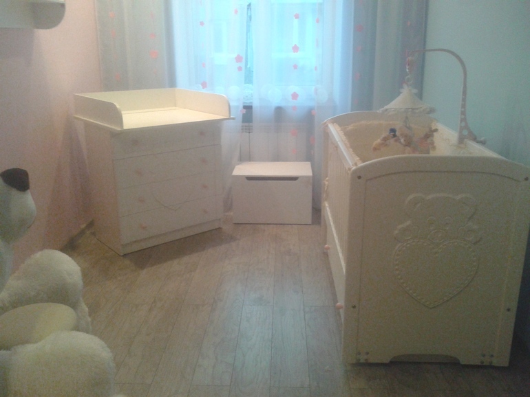 Крупногабарит + парочка вещичек))Мебель делали на заказ,выбрала с мишками,такая она красивая,на комодике,кроватке и ящичка для чего нибудь)) выбиты медвежонок с сердечком,с розовыми ручками.Жаль фото так не передает..Картинки делали сами и шарики на подоконнике..а и бабочки на стену а также декор из цветов на тюль)) ( ролокасеты на окна подрезали под свой размер и осталась ткань))
