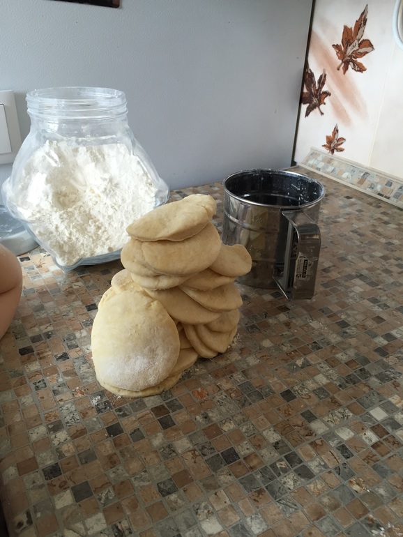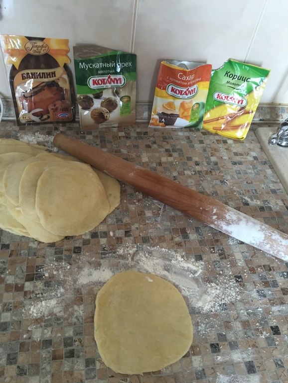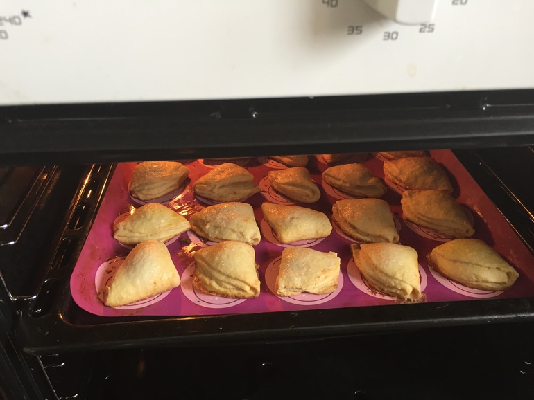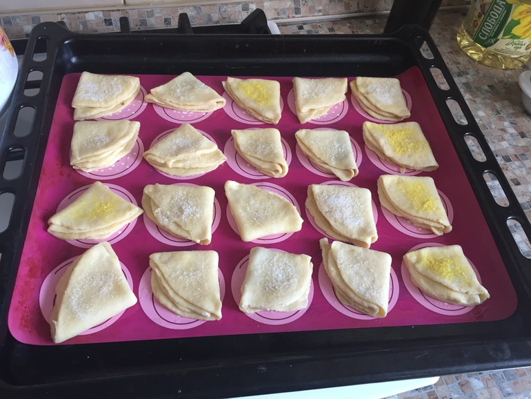 Кружочки еще раскатать, потоньше, посыпать сахаром, сложить пополам, еще посыпать, и еще сложить. Тесто не сладкое, поэтому можно побольше сахара использовать. Можно добавлять мускатный орех, или корицу.