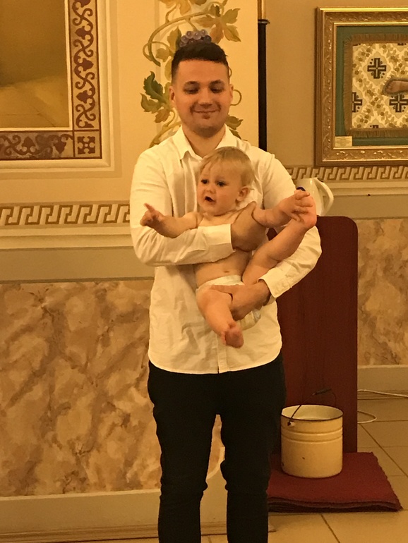 Покрестили малыша в красивой церкве недалёко от дома. Были бабушки, дедушки, младший брат мужа, моя младшая сестра и крестные. Ещё с Германии приехали мои бабушка и дедушка. Тоже были с нами вчера.