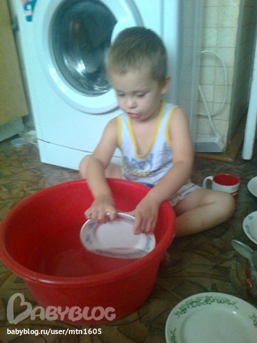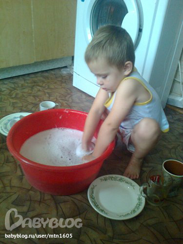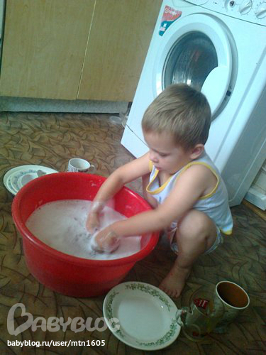 Ванечка -наше счастьеНа улице дождь и ветер. Темка спит, а мы с Ваней уже и порисовали, и поиграли, и книжку почитали. Чем заняться? Помыть посуду!