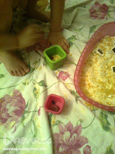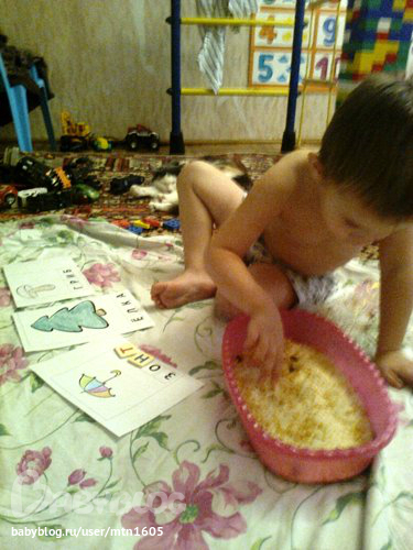 Сегодня вспоминали буквы, которые знакомы Ване. В чашку насыпала наш резервный "песок" (манка,горох,фасоль, макароны), в них закопала буковки. Ванина задача была найти буквы и соотнести их с буквами на бумаге