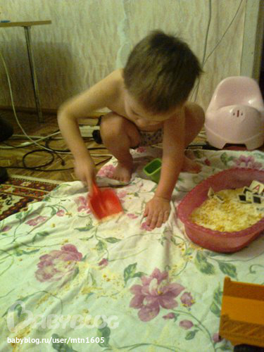Но любую игру, даже такую весёлую, надо заканчивать. Нагрузили грузовик "песком" и отвезли всё добро обратно в чашку до следущего раза.