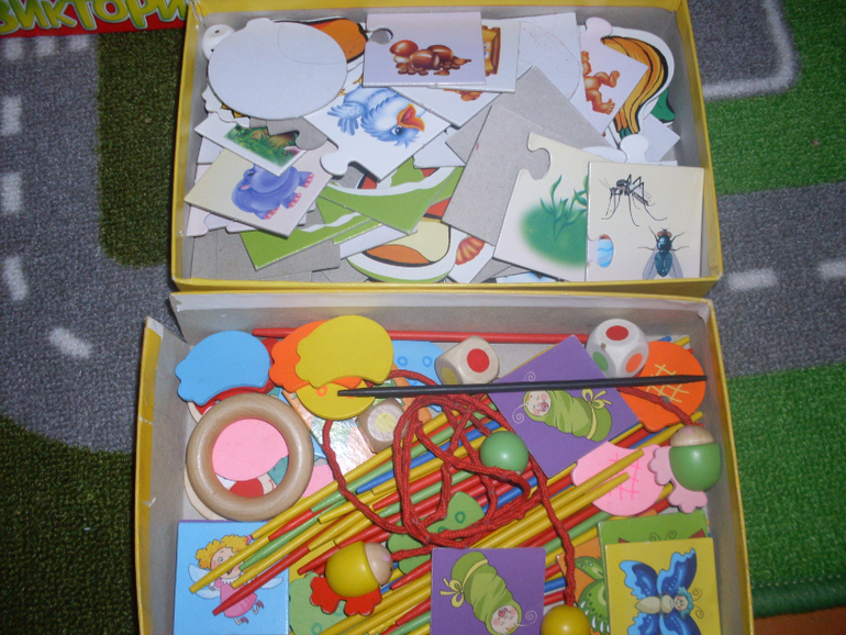 В соседней коробочке некоторые Тёмины пазлы "кто что ест" и кто где живет"