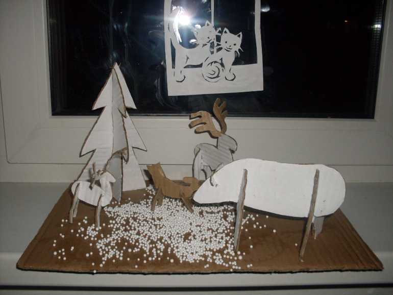 Ваня Тему назвал собакой хаски, младшему ребенку эта идея показалась забавной, он очень даже в роль вжился))) И вот пока эскимос со своей собакой играли,я вырезала заготовки для небольшой композиции " животные северной полосы России" Мальчишки придали композиции завершенный вид. В качестве снега у нас искусственный снег из май-шопа