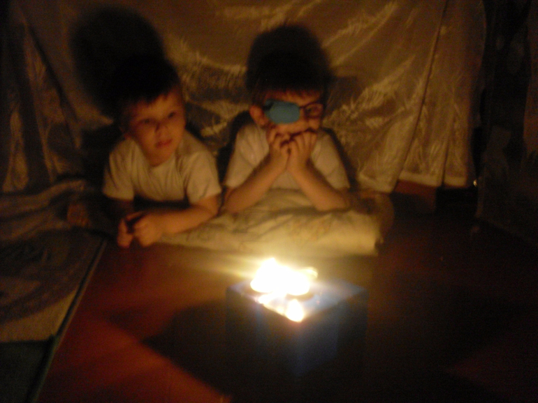 Когда на улице стемнело, мы "разожгли костер" и читали сказки народов севера. Ване настолько понравилась эта идея, что за вечер мы несколько раз "разжигали огонь" и читали сказки