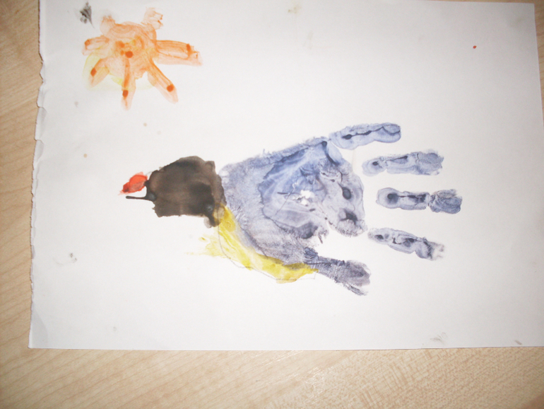 Ваня любит рисовать и Тёму к этому приобщает. Ваня картинку может наваять и на клочке бумаги, лишь бы что под руку попалось. Любит рисовать гуашью. В школе как-то рисовали птичку из отпечатка ладошки, потом весь вечер Ваня нам мастер-классы показывал)) И другие картинки из ладошек нарисовали. Оставлю все тут для памяти