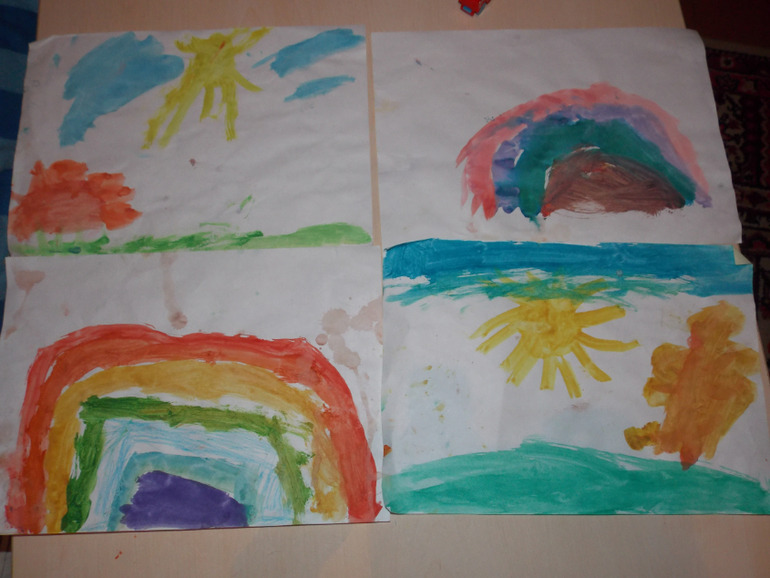 Ваня рисует много. Карандаши дома находятся в самых неожиданных местах. Тема тоже любит рисовать, но не так, как Ванька. Ваня часто стал рисовать обычной шариковой ручкой. Рисует Angry Birds)))) Мультики рисует. Фото только нет. Как-нибудь покажу) А сегодня покажу рисунки акварелью. В изо-студии они учили последовательность цветов радуги, и у нас долгое время не угасал интерес к радуге. Ваня рисовал много-много радуг.