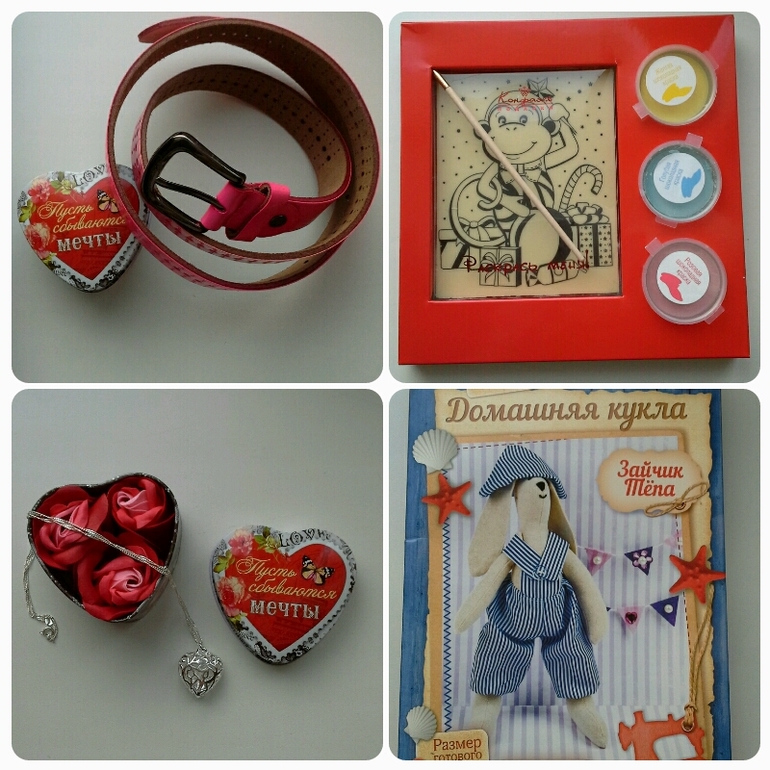 шкатулочка-сердце с приятным сюрпризом, заяц-тильда (Полина сказала, что она его сама будет шить)) и ярко розовый ремень
