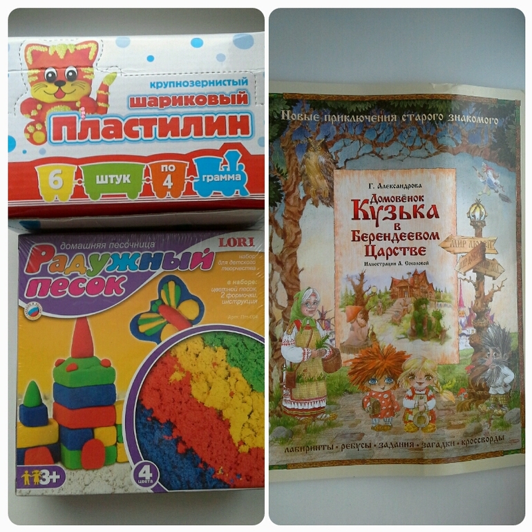 Это для Вовчика, чудо пластилин и радужный песок (шикарная вещь, он не высыхает и не застывает на воздухе, не пристает к рукам , из него можно лепить разные фигуры, короче одни плюсы, рекомендую всем мамам)