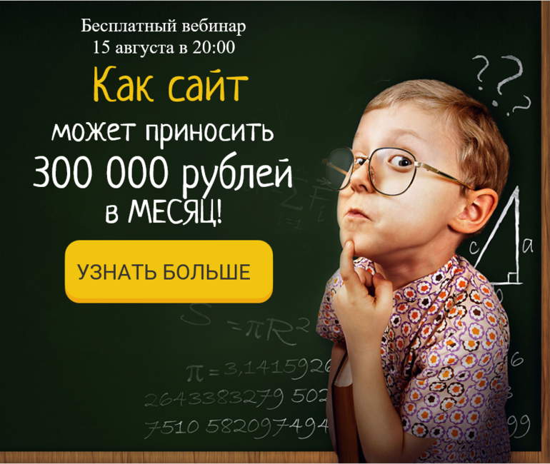 15 августа в 20:00 по Московскому времени состоится бесплатный вебинар под названием «Как сайт может приносить 300 000 рублей в месяц». РЕГИСТРИРУЙТЕСЬ ПРЯМО СЕЙЧАС!