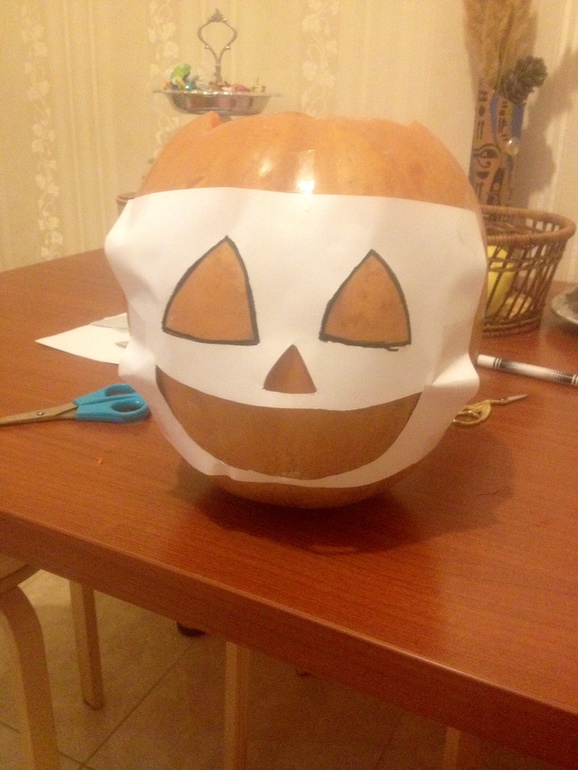 Решили сделать веселого мистера Тыкву!) Трафарет распечатали заранее.