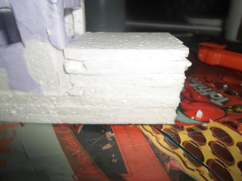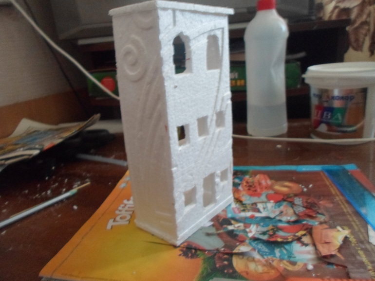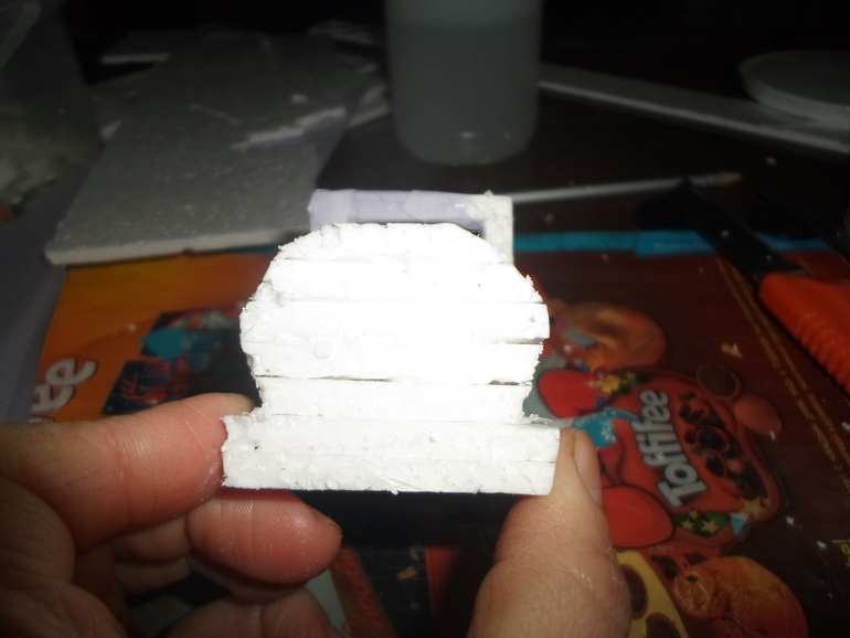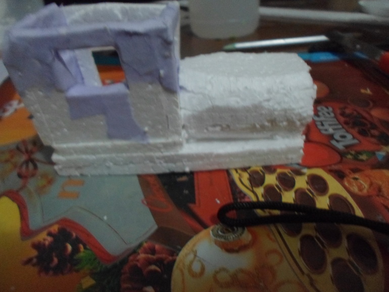 Вырезаем канцелярским ножом из пенопласта (потолочная плитка) 3 детали по желаемому размеру паровозика. Склеиваем их клеем Титан. И начинаем клеит кабину.