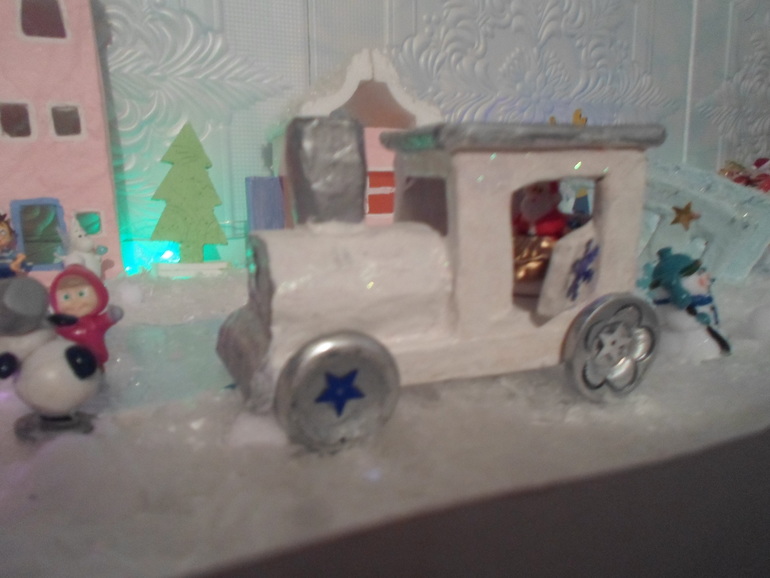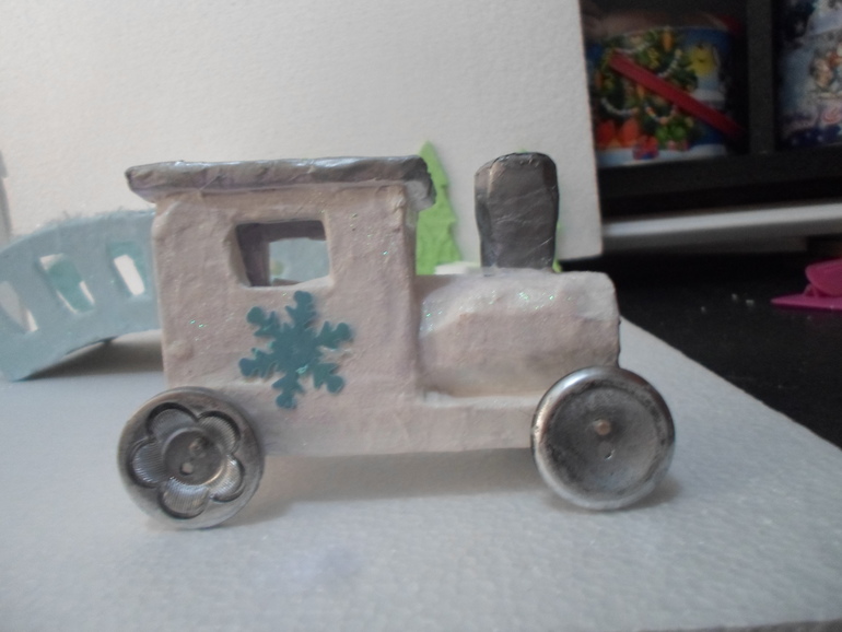 Не хватает трубы и колес и конечно дверей, я их сделала только с одной стороны. Колеса сделала из пуговиц, предварительно покрасив их краской из баллончика ( быстро сохнет), ей же с помощью губки покрасила крышу и перед ( не знаю как называется эта часть поезда)