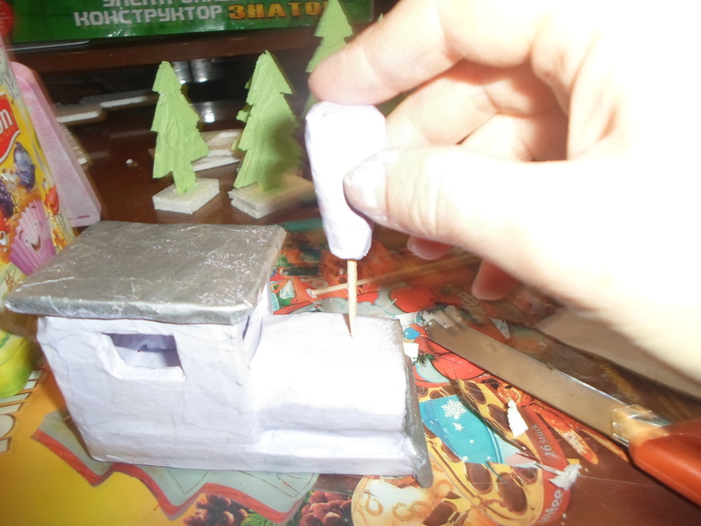 Крышу паровоза тоже сначала обклеиваем бумагой и только потом приклеиваем к основе с помощью той же бумаги. Наш паровозик почти готов, обклеиваем его бумагой. Потом сушим. Чтобы быстрее высох я сушу возле обогревателя-ветерок ( можно на батареи, но немного дольше). А я пока он сушился, приклеила елочки к подставкам, теперь они видны на заднем плане))) Кстати, все работы по вырезанию проводила на толстеньком не нужном журнале, что бы не порезать стол.