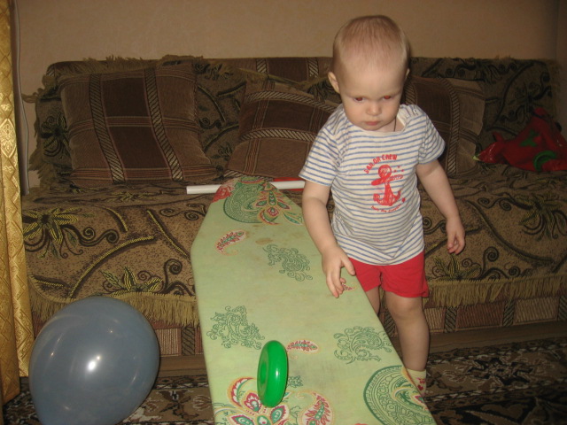 13) Спускали мячики, кубики, круги от пирамидки с горки.