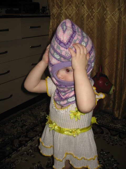 10) Когда пришел папа, мы начали играть с шапками. Когда спрашивали Сашу: "Чья это шапка". Она показывала пальчиком и говорила "Па" или "ма", а потом стали примерять шапки.