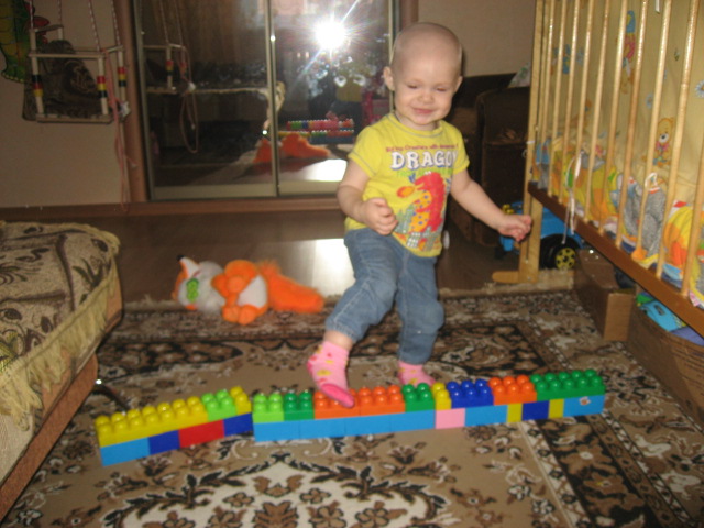7) Когда наигрались с коробкой, начали строить преграды из конструктора. Вообще Саша умеет перешагивать через пороги, но чтоб играть - мы никогда так не играли. Поэтому сначала Саша пыталась на них наступать. Я показывала как перешагивать, помогала ставить ножку, но все не помогало. А потом я начала от Саши убегать через препятствия, и Саша стала меня догонять, перешагивала через препятствия, придерживаясь за диван или кроватку, а потом уже стала перешагивать без поддержки.