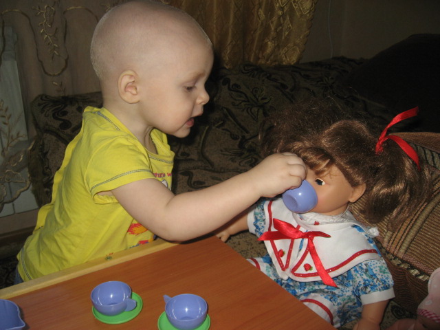 8) Набегавшись, мы решили попить чай с куклами. Взяли маленькую и большую куклу, соответственно маленькие и большие чашки. Я объясняла, что маленькую куклу надо поить с маленькой чашки, а большую с большой. Но Саша хотела поить только свою любимую куклу Марину, а маленькой кукле ничего не досталось. Я даже поменяла их местами, но это тоже не сработало, Саша тянулась и поила большую куклу со всех чашек. И отвечать на вопрос где большая или маленькая - совсем отказалась.
