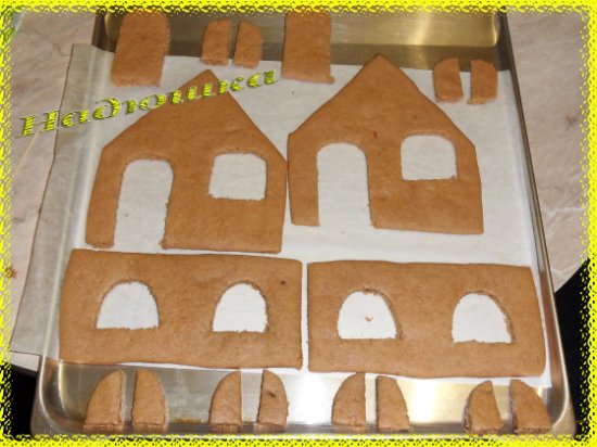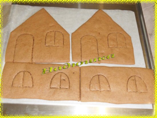 После выпечки, пока тесто ещё горячее, вырезаем детали в виде дверей и окон по таким же шаблонам, вырезанным из бумаги.