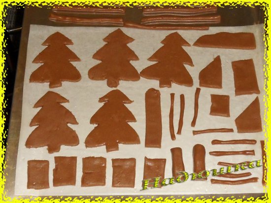 Из оставшегося теста вырезаем крышу домика, елочки, трубу, маленькие подставочки под елочки, любые интересные детали и фигурки.