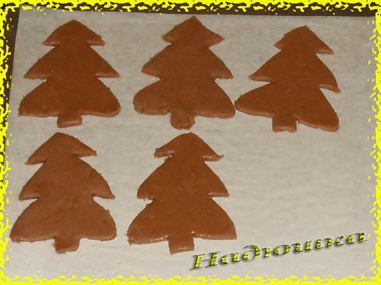 На листе пергамента раскатываем тесто в пласт толщиной 5-6мм. Если раскатать тоньше, пряник получится слишком сухим. Прикладываем готовые шаблоны и вырезаем по контуру. Убираем обрезки и перекладываем вырезанные детали вместе с пергаментом на противень.