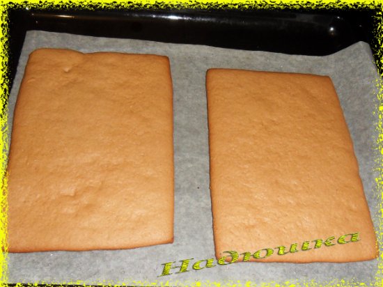 Вырезаем, пока выпечка горячая. Вырезанное окошко разрежем вдоль пополам. Это будущие ставни. Все детали остужаем на решетке.