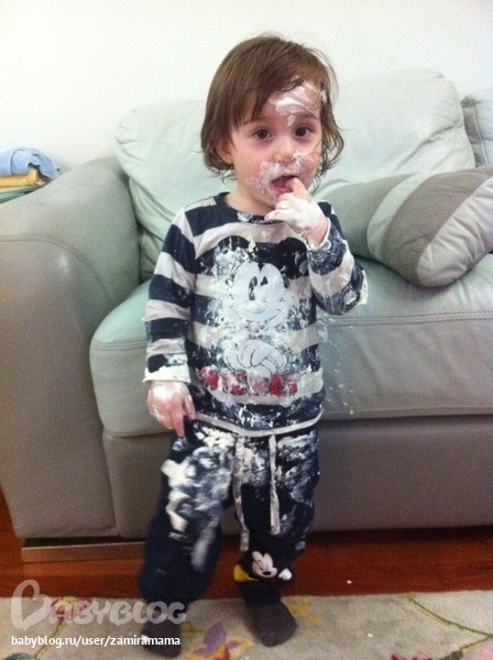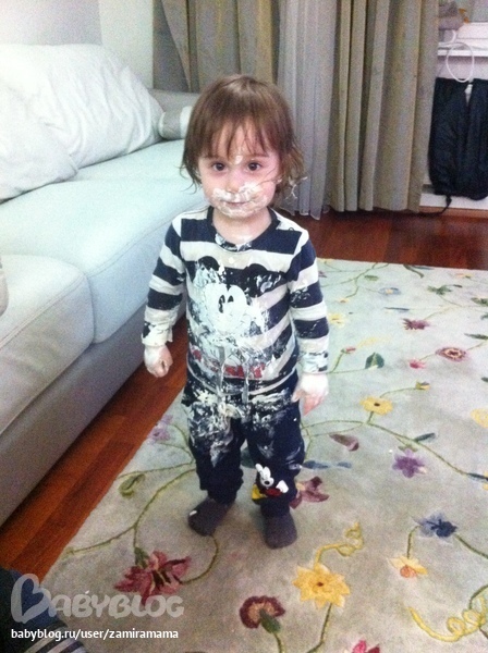 Боже мой, я балдею просто от этого пупса, если честно не знаю как бы я отреагировала, если бы у меня ребенок в сметанке так измазюкался)))
