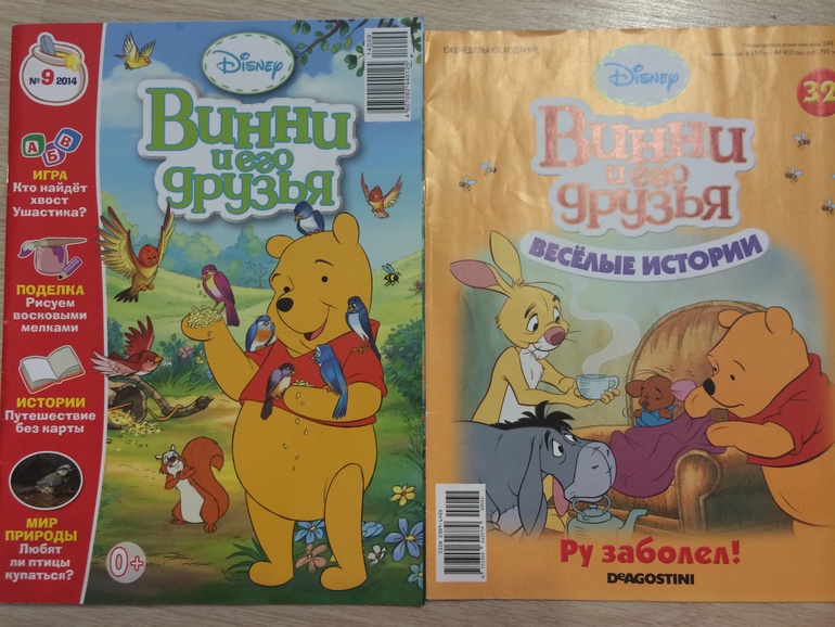Журналы про Винни уже не так популярны, но все равно читаемы. Журнал справа от Деагостини (с посудой) откровенно разочаровал((( тонкие страницы, всего одна история - больше не куплю.