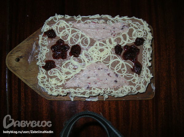 Приготовила продукты, посуду...потом оказалось нет миксера, есть только советский венчик. Вобщем тесто на бисквит делала где то пол часа. Стала искать форму под торт...ее тоже у нас нет в доме. Сделала в прямоугольной форме, под запекание курицы. Сделала крем, опять пол часа с венчиком муздыкалась)) Стала украшать. Думаю: ну вот с какао получится шоколадного цвета крем, с вареньем малиновым - розовый. (Есстественно красителей пищевых дома тоже нет) Ну думаю, что бы зифиринки получилис на торте нужно взять пакет целофановый, насыпать туда крем и сделать дырочку на кончике. Так выдавливая получатся зифиринки..угу...Пакет нашла только один - из под сыра)) Насыпала крем - стала давить. Он порвался в нескольких местах и все руки в крему))