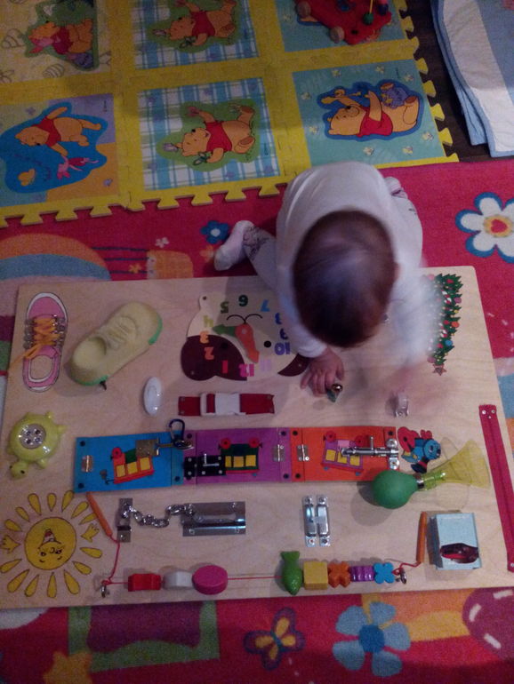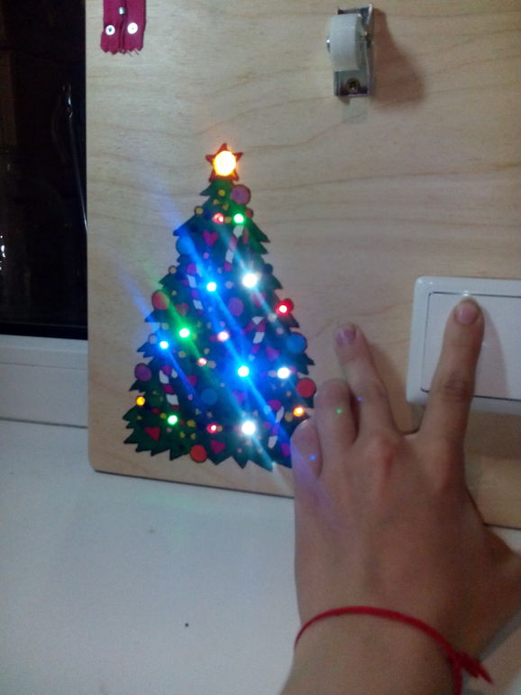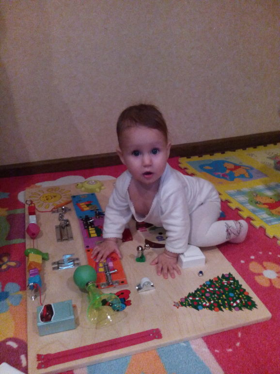 План выполнен, хотели к Новому году, получилось ещё раньше) Ребёнок в восторге!) У Лизы появилась личная ёлочка!))) Пусть пока не все предметы ей поддались, но это и хорошо, будет "на вырост") Сразу оценила елочку( моя задумка и на 50% исполнение) и очень понравились колокольчики! Следующая досочка будет для племяшки)