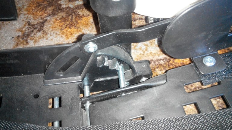 4) Прогулочный блок - это печально. Спинка регулируется ОЧЕНЬ плохо, очень туго и всегда рывком, так что заснувшего сидя ребенка нельзя опустить в горизонтальное положение, не разбудив его. Со временем, когда снимала текстиль для стирки, я увидела почему так плохо регулируется спинка. Принцип - штырек "ходит" по шестеренке. Штырек металлический, а шерстеренка пластиковая. Пластик быстро стерся, поэтому спинка регулируется рывком. Не удивлюсь, что скоро она вообще фиксироваться не будет. Вот фото с одной тсороны. со второй еще печальнее.