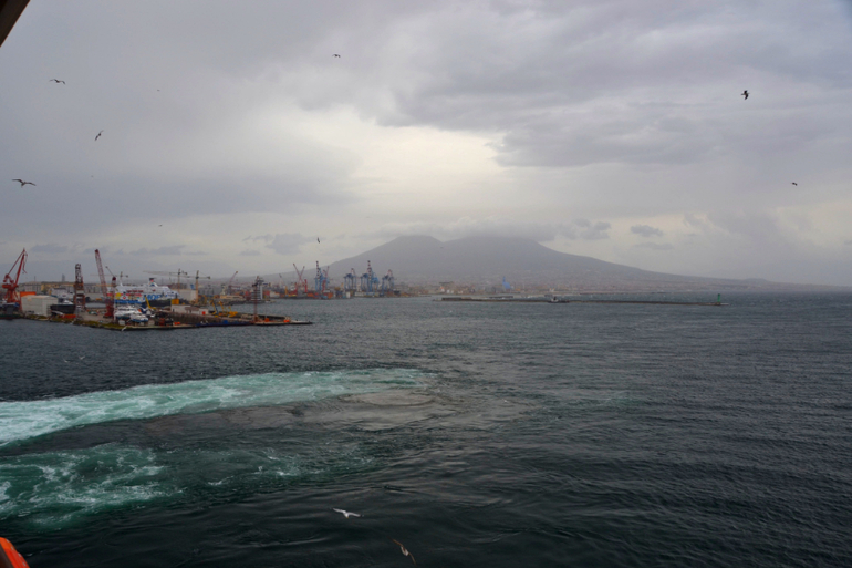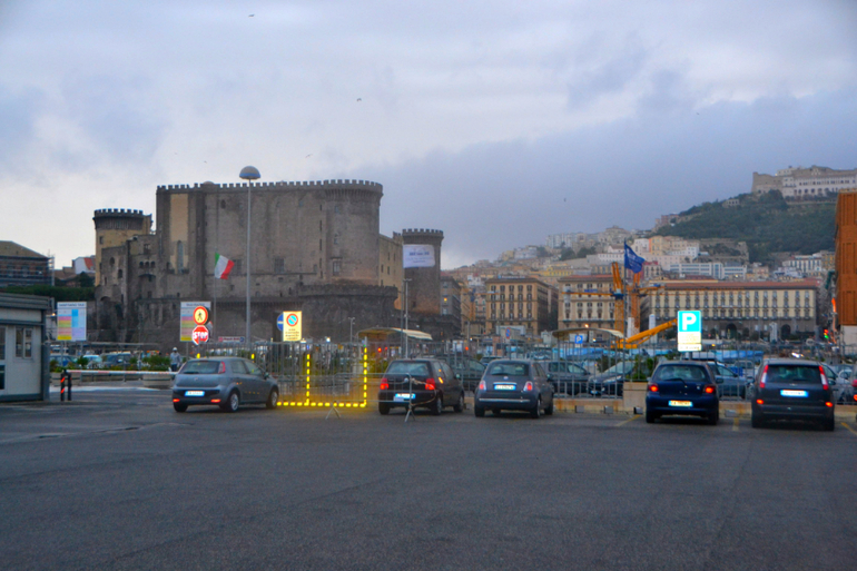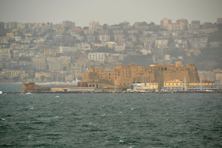 Неаполь встретил нас пасмурной погодой, но без дождя, что не могло не радовать. Вдалеке был виден «Замок яйца» (или Castel dell'Ovo), расположенный на вулканическом острове в Неаполитанском заливе и соединенный с набережной тонким перешейком.