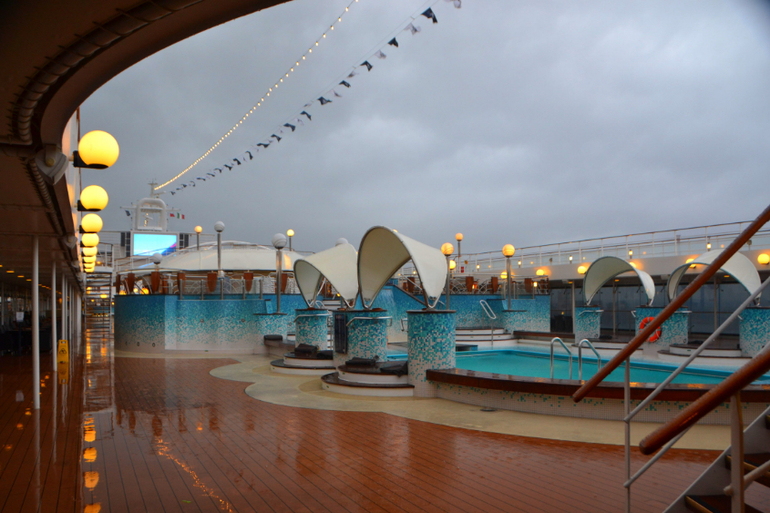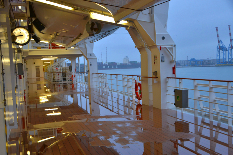 По открытым палубам можно было гулять только с зонтом в резиновых сапогах)