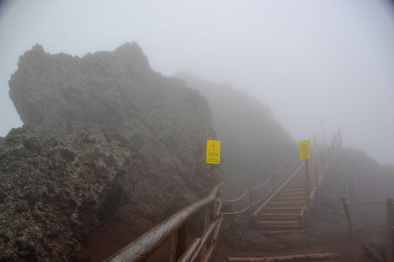 На вершине вулкана царила потрясающая атмосфера: дул очень сильный ветер, моросил мелкий дождь, видимость была не больше пару метров. Все 4 стихии слились воедино: жар вулкана, земля, ветер и вода.