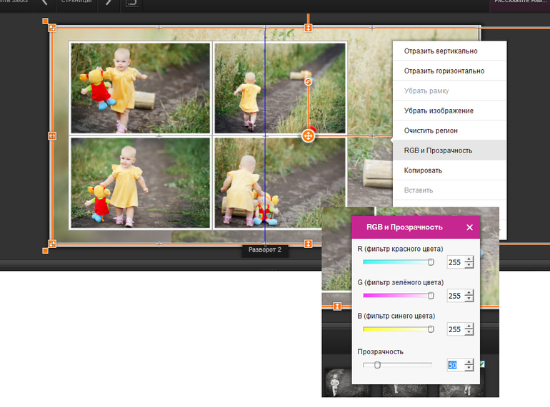 Фоновую фотографию можно сделать чуточку бледнее остальных. Для этого правой кнопкой мыши щелкаем на фото, выбираем пункт "RGB и прозрачность" и в открывшимся окошке меняем прозрачность. Выберете комфортное вам значение.