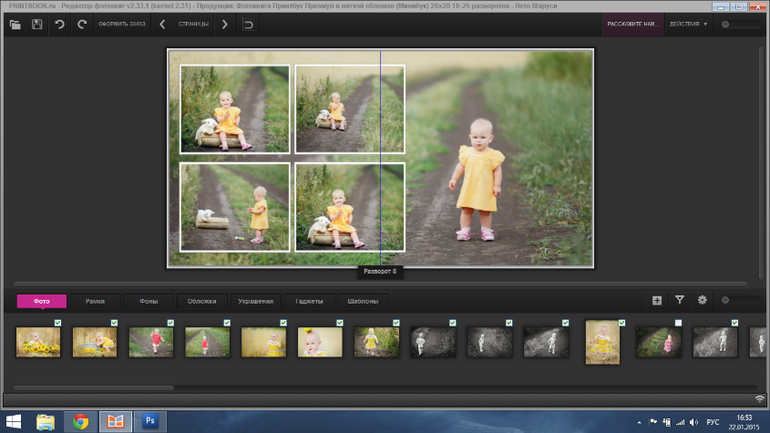 1. Выбор фотографий. Выбираем самые лучшие, только четкие. Открываем вкладку редктора "фото" внизу. Перетаскиваем ВСЕ фотографии сразу в окно программки. Оттуда мы потом будем перетаскивать их на страницы будущей книги. Пока она называется макетом! В обновленном редакторе стало удобнее работать с фотографиями. У каждой фотографии есть маленькое окошко в уголке. Там появляется галочка, если вы эту фотографию уже вставили в книгу. Теперь не получится повторных фото в книге, и ни одна фоточка не забудется.
