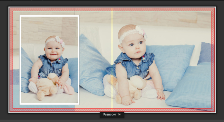Дальше перетаскиваем фотографии в созданные места и располагаем как хочется. У меня все симметричн-паралельно-перпендикулярно ))) Следите за этими красными полями! Важные элементы не должны попасть в красную область.