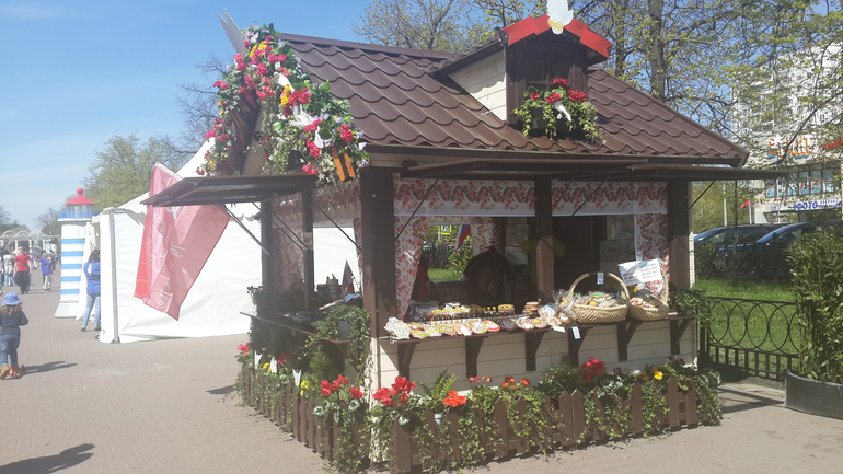 По дороге встретилась городская ярмарка с весьма своеобразным убранством. Георгиевские ленты с искусственными голубями и цветами для украшения ларьков с едой решение, на мой взгляд, специфическое.